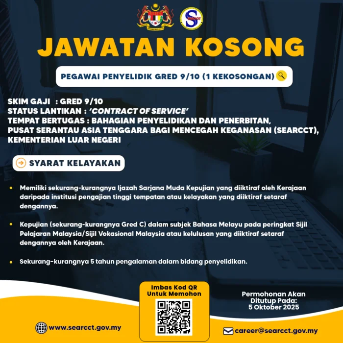 Sukacita dimaklumkan bahawa terdapat kekosongan jawatan Pegawai Penyelidik (Gred 9/10) di SEARCCT. Permohonan dibuka sehingga 5 Oktober 2025.